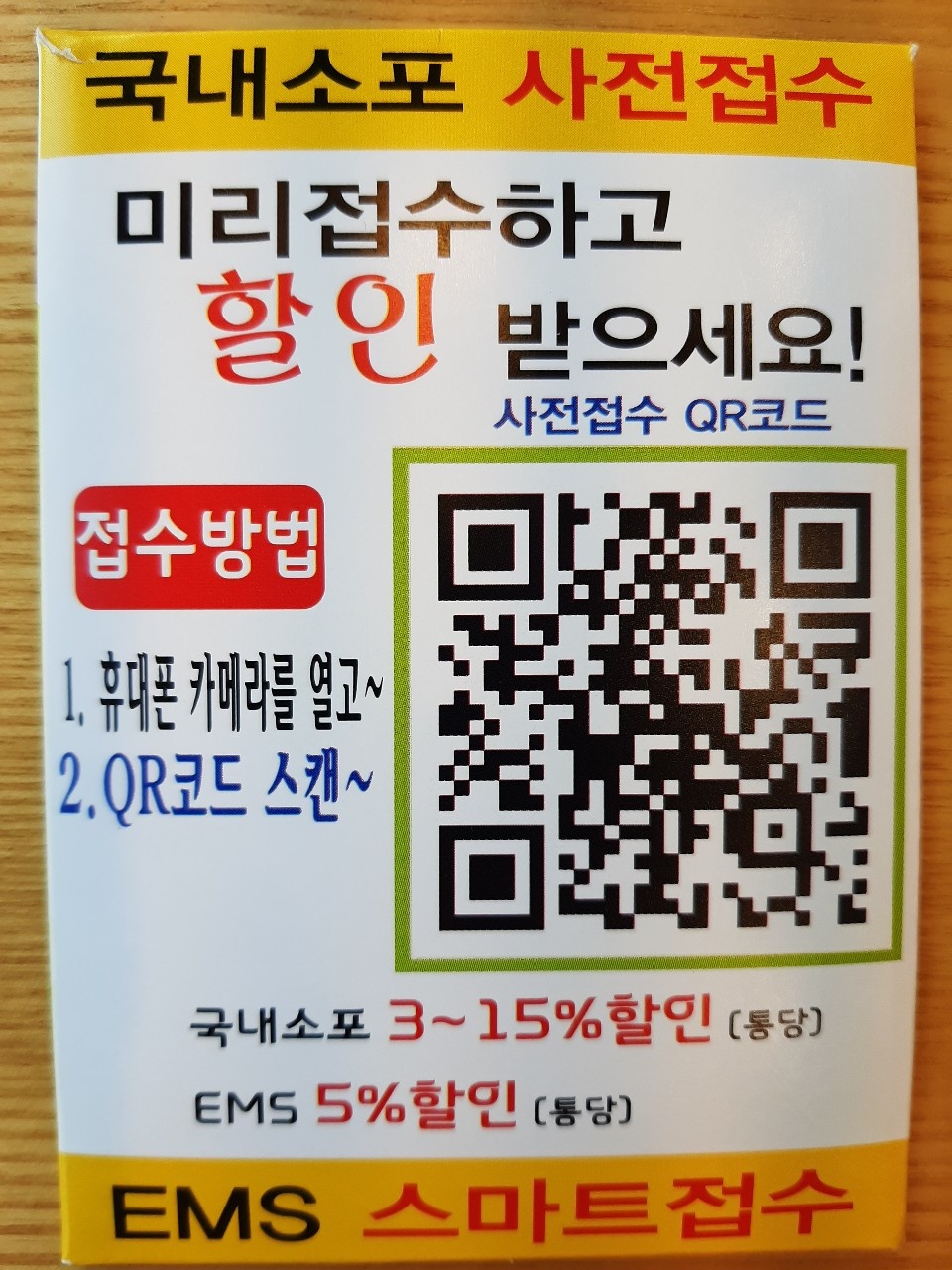 이러한 서비스를 우체국에서도 확인할 수 있습니다. 우체국 방문 전에 미리 사전접수 하고 우체국에 방문하시면 국내 소포 운임은 3~15%까지 할인받을 수 있고, EMS의 경우는 5% 할인받을 수 있습니다! 물론 우체국에 회원으로 등록돼있어야 할인이 가능합니다.