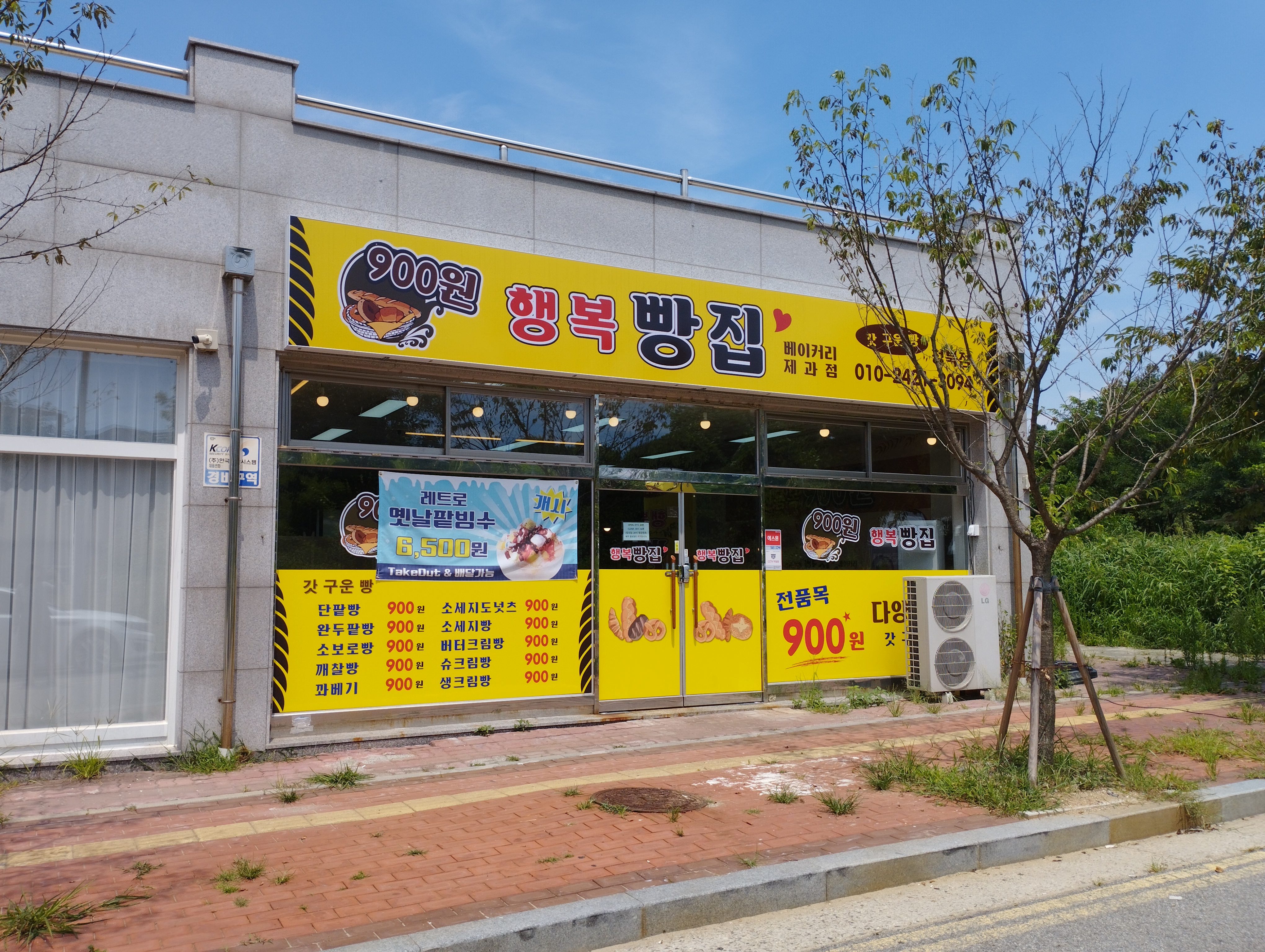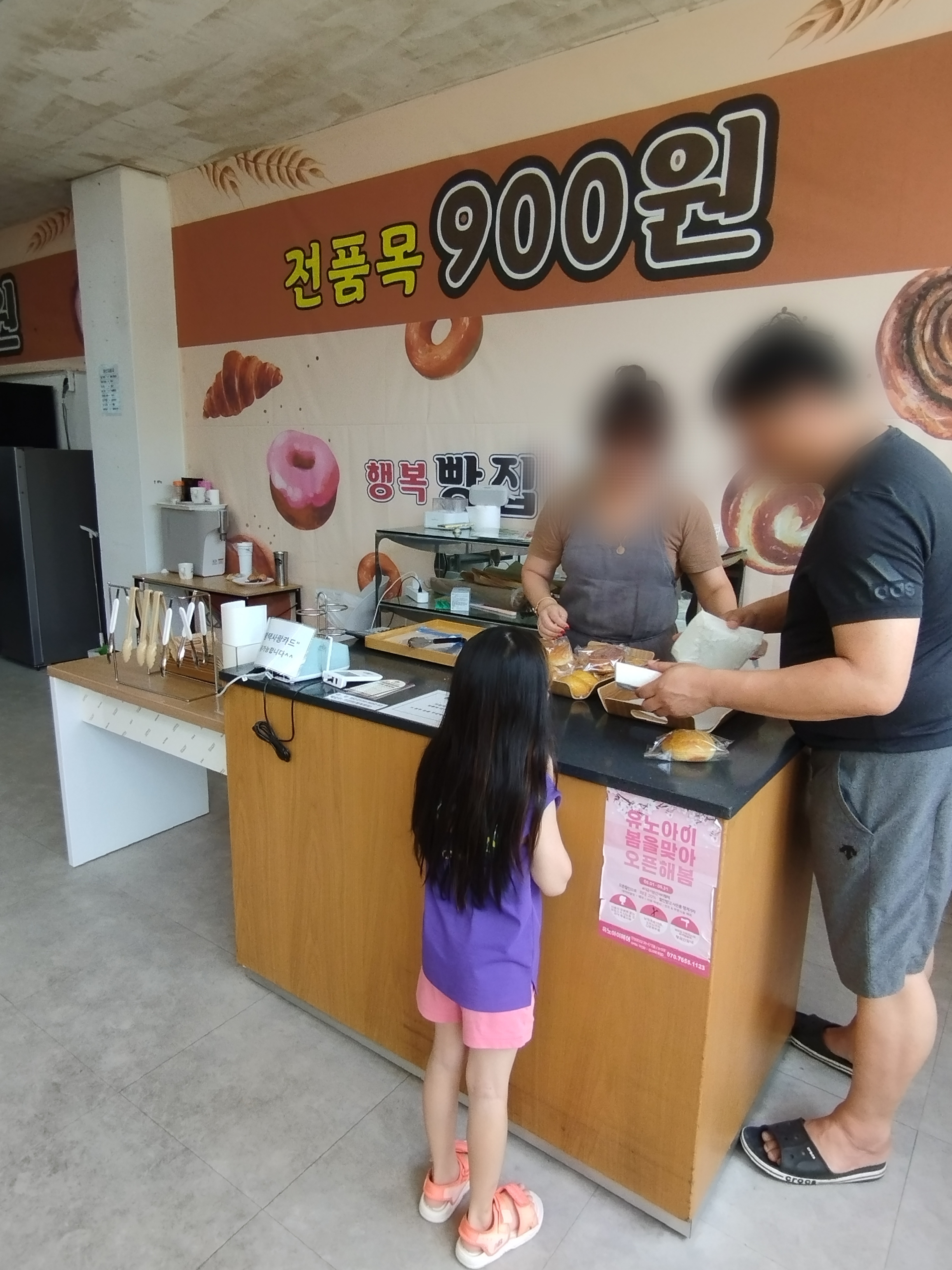 경기도 평택시 청북신도시에 위치한 행복빵집입니다. 빵집에 들어서니 벽면에 크게 전품목 900원이라고 적혀있습니다. 빵 종류는 정말 다양했고 샐러드빵(2,000원)을 제외한 모든 빵은 900원입니다. 판매하는 빵은 모두 가게에서 만드는 빵으로 저희 식구도 들어가자 마자 트레이에 빵을 담았습니다. 가격면에서 메리트가 있고 종류도 다양하다보니 정말 많이 담았습니다! 한 눈에 담기지 않을 정도로 빵집 규모가 컸고 사장님 부부도 매우 친절하셨습니다.